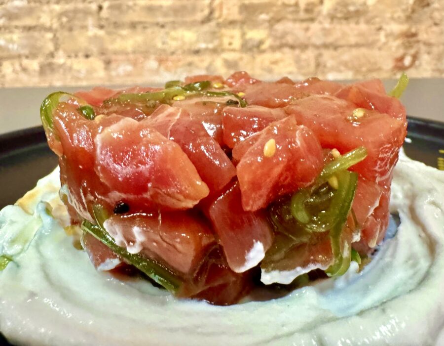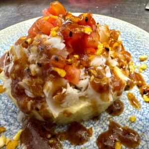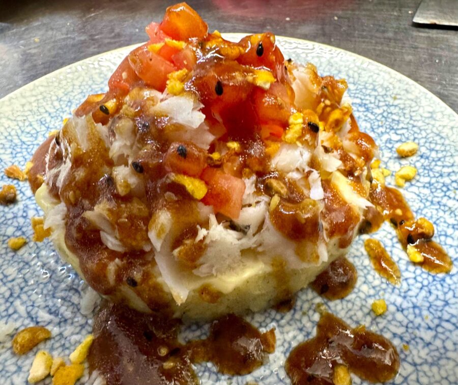 - Causa limeña con mayonesa de wasabi, merluza, tomate, quicos y salsa japonesa